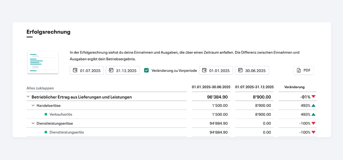 Die Erfolgsrechnung ermöglicht jetzt den Vergleich mit der Vorperiode. So erkennst du Entwicklungen und Veränderungen auf einen Blick.
